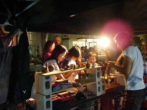 しかし店は雑貨屋子子子さんとうちの2つ必要~とちょっと困った顔をしていたら、雑貨屋子子子オーナーのおじ様が、なんとお優しい~~~雑貨屋子子子まで電気を取りに行ってくれました。感謝感謝です。そんなこんなで、2つのテントに明かりがつき、さ~売るぞ!!と思っていたら、隣でなにやらよっぱらい?きゃ~雑貨屋子子子の看板娘!酔っ払ってる~ってちょっと大げさですが、顔を赤く染めてなにやら楽しげに地元高校生バンドの歌に踊っています。私もつられ楽しくなり、ちょっと2人で店を空け(貴重品は持った!)バンドの群れに参戦!